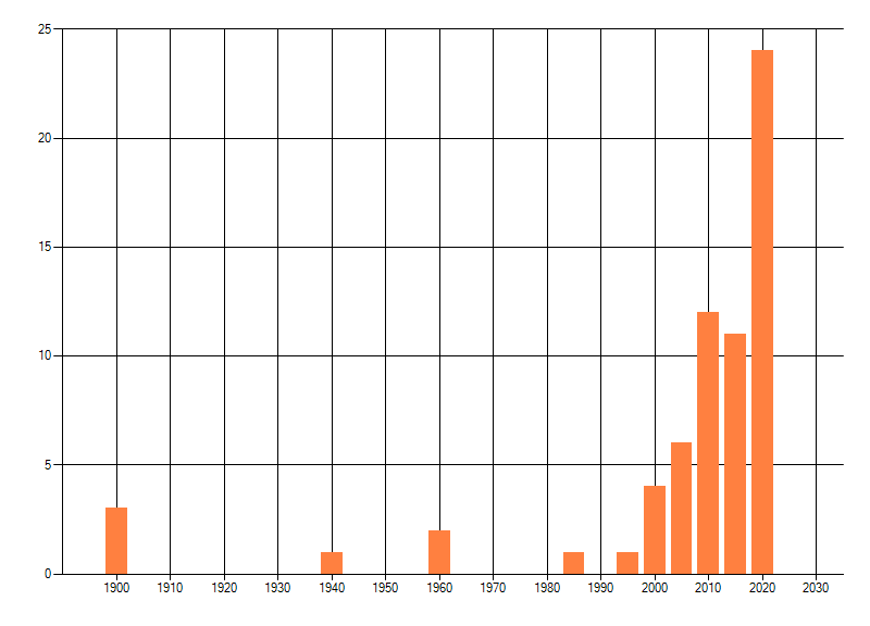 Het aantal atlasblokken (5x5 km) waarin de soort is gemeld binnen een periode van vijf jaar (vanaf 1980) of twintig jaar. Niet gecorrigeerd voor waarnemersinspanning en het aantal doorgegeven waarnemingen kan sterk variëren per periode, dus een trend in verspreiding kan hier niet direct uit worden afgelezen. Het opgegeven jaartal is het eerste jaar van de periode. Bron: gevalideerde waarnemingen uit de NDFF.