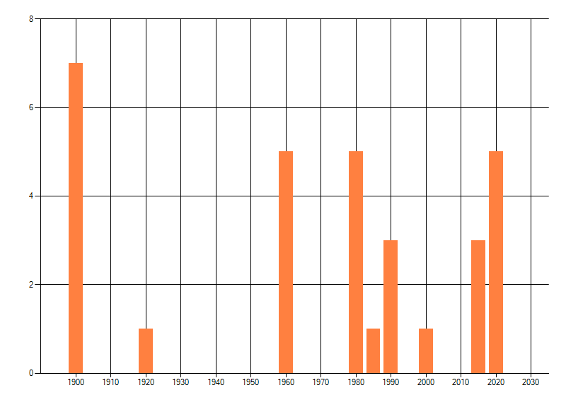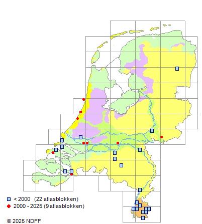 Het aantal atlasblokken (5x5 km) waarin de soort is gemeld binnen een periode van vijf jaar (vanaf 1980) of twintig jaar. Niet gecorrigeerd voor waarnemersinspanning en het aantal doorgegeven waarnemingen kan sterk variëren per periode, dus een trend in verspreiding kan hier niet direct uit worden afgelezen. Het opgegeven jaartal is het eerste jaar van de periode. Bron: gevalideerde waarnemingen uit de NDFF.