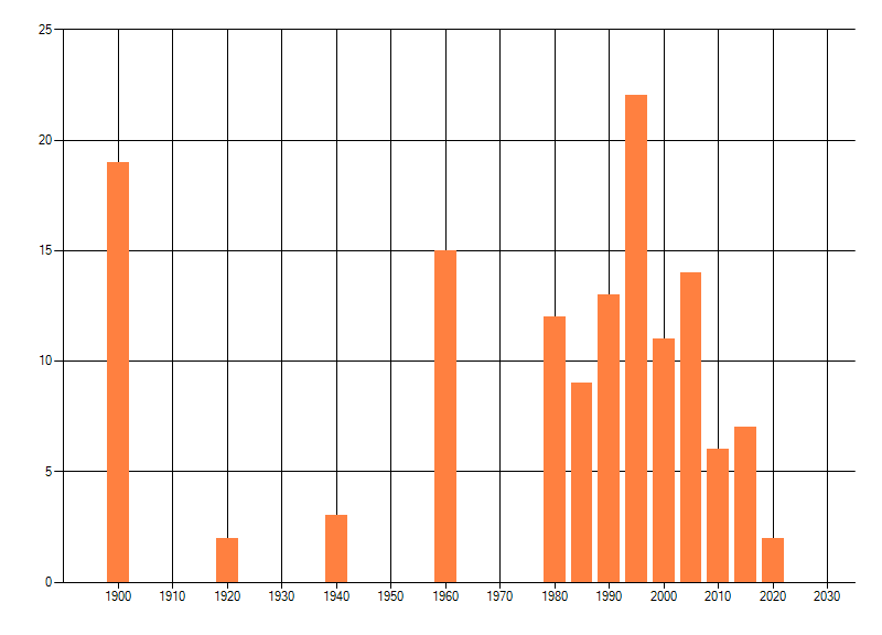 Het aantal atlasblokken (5x5 km) waarin de soort is gemeld binnen een periode van vijf jaar (vanaf 1980) of twintig jaar. Niet gecorrigeerd voor waarnemersinspanning en het aantal doorgegeven waarnemingen kan sterk variëren per periode, dus een trend in verspreiding kan hier niet direct uit worden afgelezen. Het opgegeven jaartal is het eerste jaar van de periode. Bron: gevalideerde waarnemingen uit de NDFF.