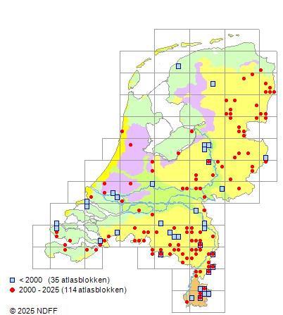 Het aantal atlasblokken (5x5 km) waarin de soort is gemeld binnen een periode van vijf jaar (vanaf 1980) of twintig jaar. Niet gecorrigeerd voor waarnemersinspanning en het aantal doorgegeven waarnemingen kan sterk variëren per periode, dus een trend in verspreiding kan hier niet direct uit worden afgelezen. Het opgegeven jaartal is het eerste jaar van de periode. Bron: gevalideerde waarnemingen uit de NDFF.