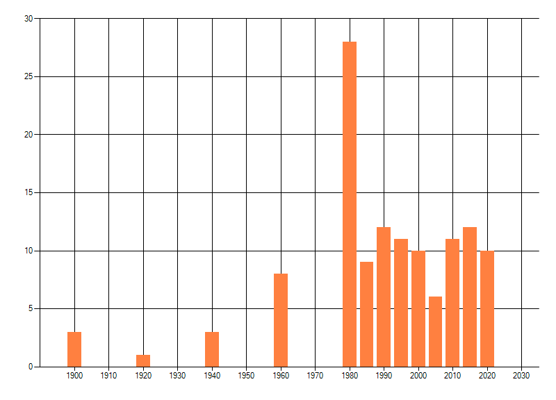 Het aantal atlasblokken (5x5 km) waarin de soort is gemeld binnen een periode van vijf jaar (vanaf 1980) of twintig jaar. Niet gecorrigeerd voor waarnemersinspanning en het aantal doorgegeven waarnemingen kan sterk variëren per periode, dus een trend in verspreiding kan hier niet direct uit worden afgelezen. Het opgegeven jaartal is het eerste jaar van de periode. Bron: gevalideerde waarnemingen uit de NDFF.