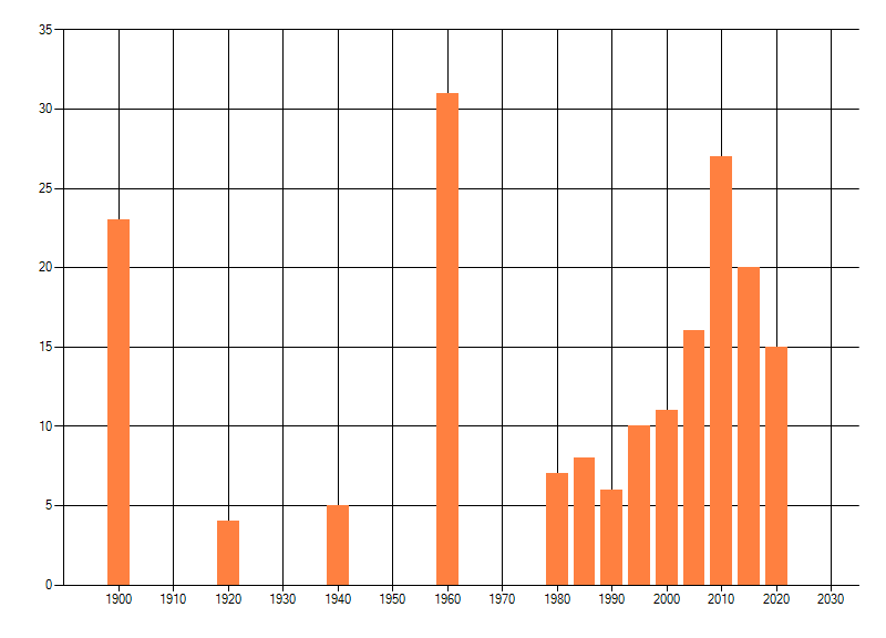 Het aantal atlasblokken (5x5 km) waarin de soort is gemeld binnen een periode van vijf jaar (vanaf 1980) of twintig jaar. Niet gecorrigeerd voor waarnemersinspanning en het aantal doorgegeven waarnemingen kan sterk variëren per periode, dus een trend in verspreiding kan hier niet direct uit worden afgelezen. Het opgegeven jaartal is het eerste jaar van de periode. Bron: gevalideerde waarnemingen uit de NDFF.