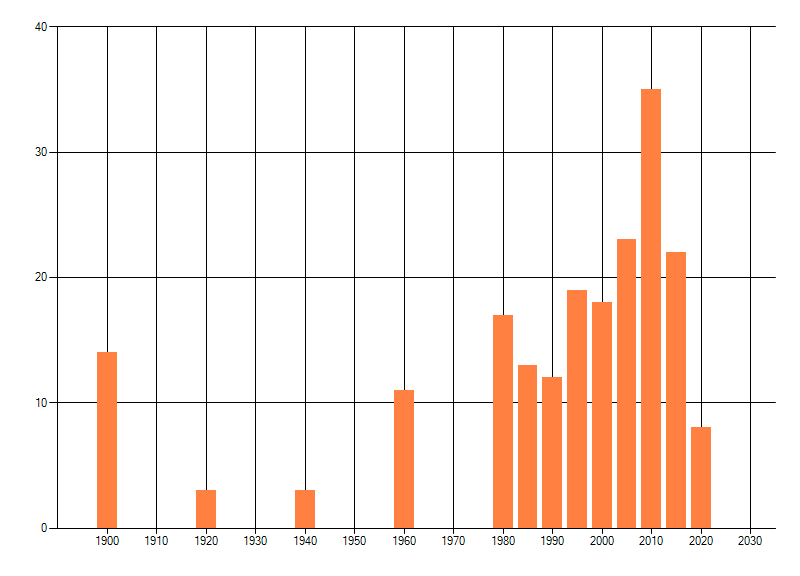 Het aantal atlasblokken (5x5 km) waarin de soort is gemeld binnen een periode van vijf jaar (vanaf 1980) of twintig jaar. Niet gecorrigeerd voor waarnemersinspanning en het aantal doorgegeven waarnemingen kan sterk variëren per periode, dus een trend in verspreiding kan hier niet direct uit worden afgelezen. Het opgegeven jaartal is het eerste jaar van de periode. Bron: gevalideerde waarnemingen uit de NDFF.