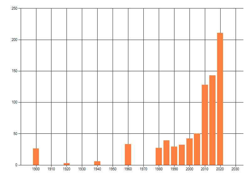 Het aantal atlasblokken (5x5 km) waarin de soort is gemeld binnen een periode van vijf jaar (vanaf 1980) of twintig jaar. Niet gecorrigeerd voor waarnemersinspanning en het aantal doorgegeven waarnemingen kan sterk variëren per periode, dus een trend in verspreiding kan hier niet direct uit worden afgelezen. Het opgegeven jaartal is het eerste jaar van de periode. Bron: gevalideerde waarnemingen uit de NDFF.