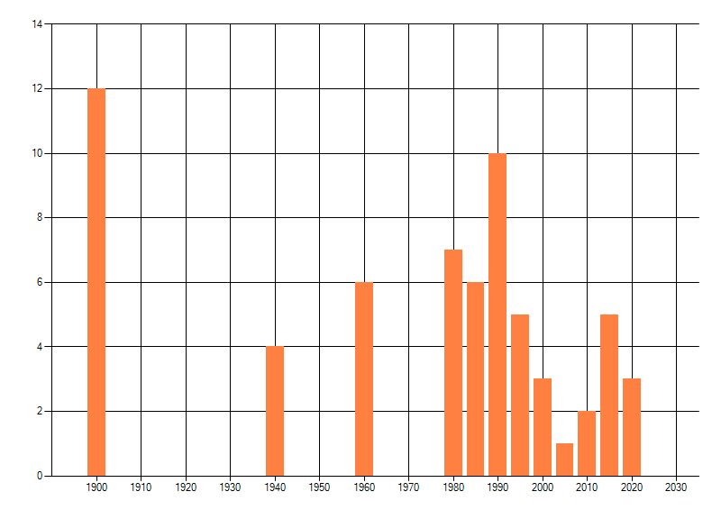 Het aantal atlasblokken (5x5 km) waarin de soort is gemeld binnen een periode van vijf jaar (vanaf 1980) of twintig jaar. Niet gecorrigeerd voor waarnemersinspanning en het aantal doorgegeven waarnemingen kan sterk variëren per periode, dus een trend in verspreiding kan hier niet direct uit worden afgelezen. Het opgegeven jaartal is het eerste jaar van de periode. Bron: gevalideerde waarnemingen uit de NDFF.