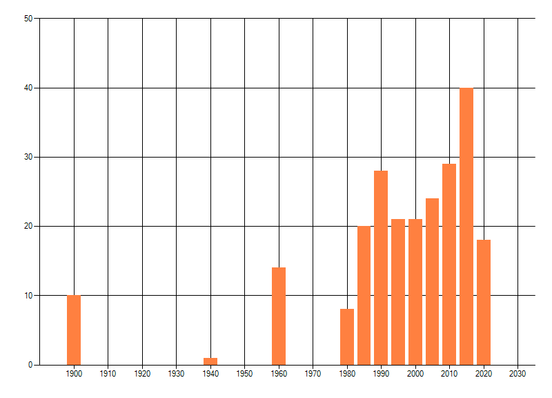 Het aantal atlasblokken (5x5 km) waarin de soort is gemeld binnen een periode van vijf jaar (vanaf 1980) of twintig jaar. Niet gecorrigeerd voor waarnemersinspanning en het aantal doorgegeven waarnemingen kan sterk variëren per periode, dus een trend in verspreiding kan hier niet direct uit worden afgelezen. Het opgegeven jaartal is het eerste jaar van de periode. Bron: gevalideerde waarnemingen uit de NDFF.
