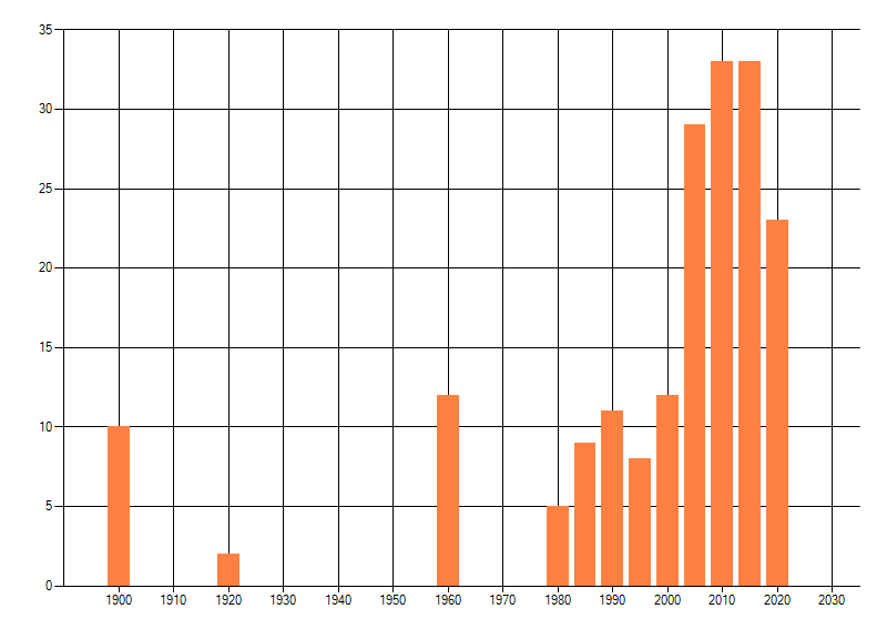 Het aantal atlasblokken (5x5 km) waarin de soort is gemeld binnen een periode van vijf jaar (vanaf 1980) of twintig jaar. Niet gecorrigeerd voor waarnemersinspanning en het aantal doorgegeven waarnemingen kan sterk variëren per periode, dus een trend in verspreiding kan hier niet direct uit worden afgelezen. Het opgegeven jaartal is het eerste jaar van de periode. Bron: gevalideerde waarnemingen uit de NDFF.