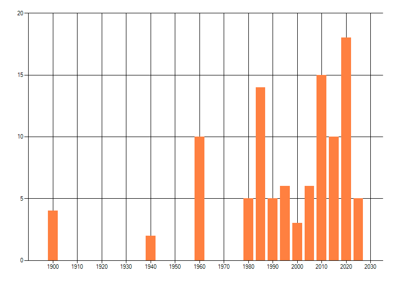 Het aantal atlasblokken (5x5 km) waarin de soort is gemeld binnen een periode van vijf jaar (vanaf 1980) of twintig jaar. Niet gecorrigeerd voor waarnemersinspanning en het aantal doorgegeven waarnemingen kan sterk variëren per periode, dus een trend in verspreiding kan hier niet direct uit worden afgelezen. Het opgegeven jaartal is het eerste jaar van de periode. Bron: gevalideerde waarnemingen uit de NDFF.