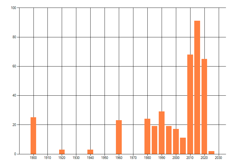 Het aantal atlasblokken (5x5 km) waarin de soort is gemeld binnen een periode van vijf jaar (vanaf 1980) of twintig jaar. Niet gecorrigeerd voor waarnemersinspanning en het aantal doorgegeven waarnemingen kan sterk variëren per periode, dus een trend in verspreiding kan hier niet direct uit worden afgelezen. Het opgegeven jaartal is het eerste jaar van de periode. Bron: gevalideerde waarnemingen uit de NDFF.