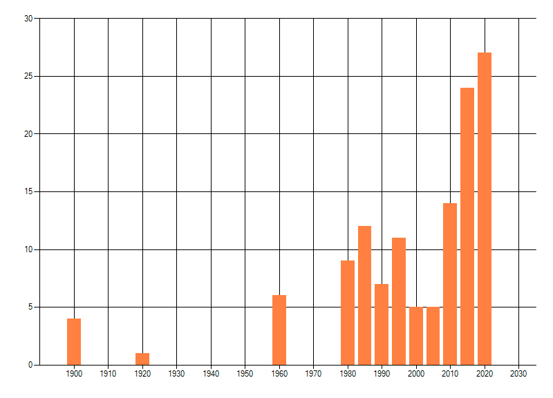 Het aantal atlasblokken (5x5 km) waarin de soort is gemeld binnen een periode van vijf jaar (vanaf 1980) of twintig jaar. Niet gecorrigeerd voor waarnemersinspanning en het aantal doorgegeven waarnemingen kan sterk variëren per periode, dus een trend in verspreiding kan hier niet direct uit worden afgelezen. Het opgegeven jaartal is het eerste jaar van de periode. Bron: gevalideerde waarnemingen uit de NDFF.
