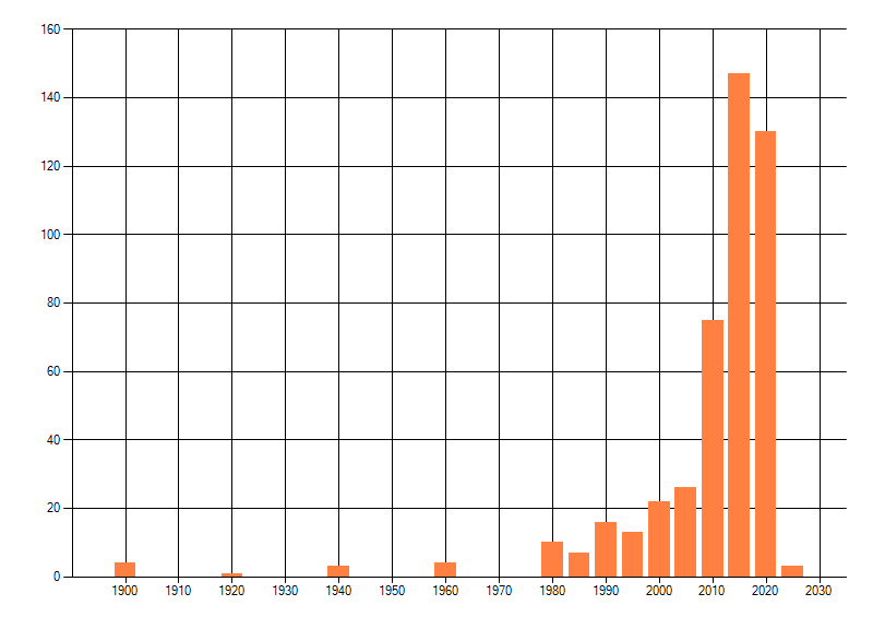 Het aantal atlasblokken (5x5 km) waarin de soort is gemeld binnen een periode van vijf jaar (vanaf 1980) of twintig jaar. Niet gecorrigeerd voor waarnemersinspanning en het aantal doorgegeven waarnemingen kan sterk variëren per periode, dus een trend in verspreiding kan hier niet direct uit worden afgelezen. Het opgegeven jaartal is het eerste jaar van de periode. Bron: gevalideerde waarnemingen uit de NDFF.