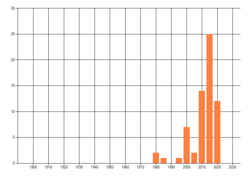 Het aantal atlasblokken (5x5 km) waarin de soort is gemeld binnen een periode van vijf jaar (vanaf 1980) of twintig jaar. Niet gecorrigeerd voor waarnemersinspanning en het aantal doorgegeven waarnemingen kan sterk variëren per periode, dus een trend in verspreiding kan hier niet direct uit worden afgelezen. Het opgegeven jaartal is het eerste jaar van de periode. Bron: gevalideerde waarnemingen uit de NDFF.