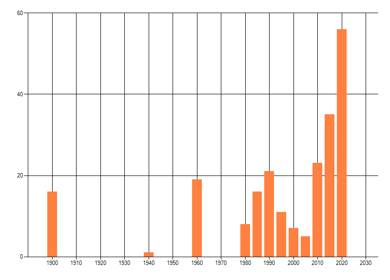 Het aantal atlasblokken (5x5 km) waarin de soort is gemeld binnen een periode van vijf jaar (vanaf 1980) of twintig jaar. Niet gecorrigeerd voor waarnemersinspanning en het aantal doorgegeven waarnemingen kan sterk variëren per periode, dus een trend in verspreiding kan hier niet direct uit worden afgelezen. Het opgegeven jaartal is het eerste jaar van de periode. Bron: gevalideerde waarnemingen uit de NDFF.