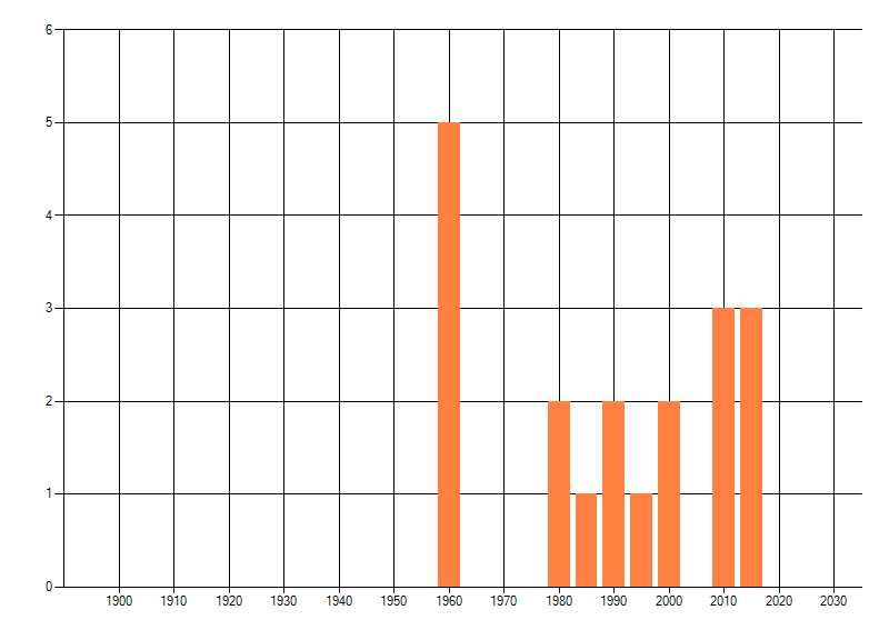 Het aantal atlasblokken (5x5 km) waarin de soort is gemeld binnen een periode van vijf jaar (vanaf 1980) of twintig jaar. Niet gecorrigeerd voor waarnemersinspanning en het aantal doorgegeven waarnemingen kan sterk variëren per periode, dus een trend in verspreiding kan hier niet direct uit worden afgelezen. Het opgegeven jaartal is het eerste jaar van de periode. Bron: gevalideerde waarnemingen uit de NDFF.