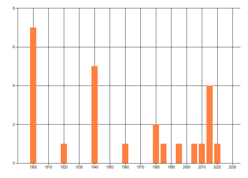 Het aantal atlasblokken (5x5 km) waarin de soort is gemeld binnen een periode van vijf jaar (vanaf 1980) of twintig jaar. Niet gecorrigeerd voor waarnemersinspanning en het aantal doorgegeven waarnemingen kan sterk variëren per periode, dus een trend in verspreiding kan hier niet direct uit worden afgelezen. Het opgegeven jaartal is het eerste jaar van de periode. Bron: gevalideerde waarnemingen uit de NDFF.