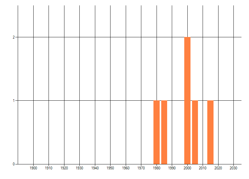 Het aantal atlasblokken (5x5 km) waarin de soort is gemeld binnen een periode van vijf jaar (vanaf 1980) of twintig jaar. Niet gecorrigeerd voor waarnemersinspanning en het aantal doorgegeven waarnemingen kan sterk variëren per periode, dus een trend in verspreiding kan hier niet direct uit worden afgelezen. Het opgegeven jaartal is het eerste jaar van de periode. Bron: gevalideerde waarnemingen uit de NDFF.