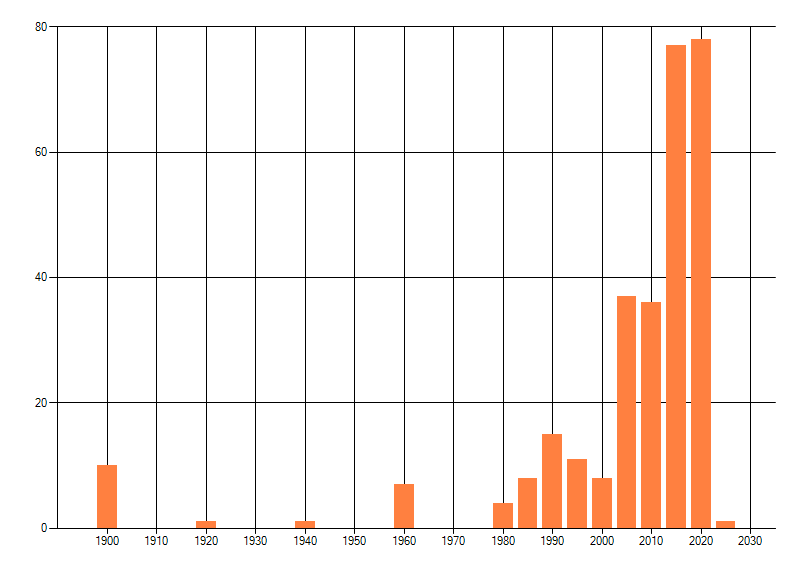 Het aantal atlasblokken (5x5 km) waarin de soort is gemeld binnen een periode van vijf jaar (vanaf 1980) of twintig jaar. Niet gecorrigeerd voor waarnemersinspanning en het aantal doorgegeven waarnemingen kan sterk variëren per periode, dus een trend in verspreiding kan hier niet direct uit worden afgelezen. Het opgegeven jaartal is het eerste jaar van de periode. Bron: gevalideerde waarnemingen uit de NDFF.