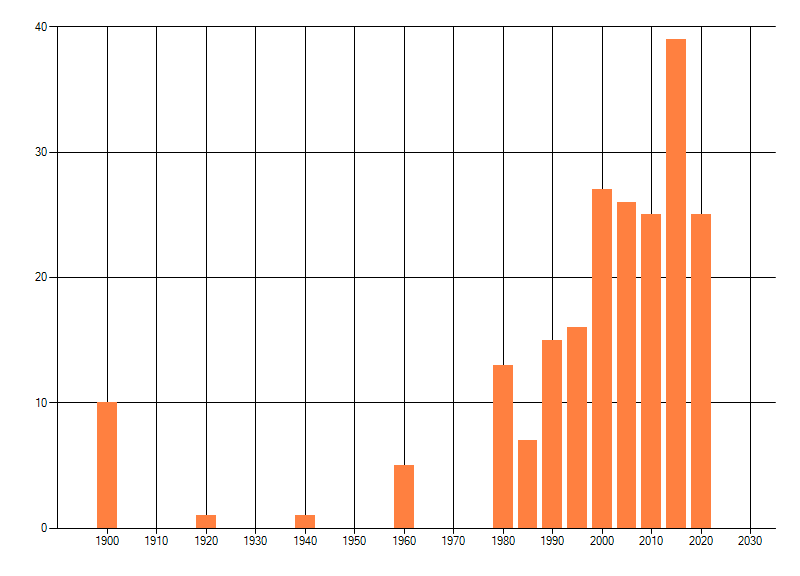 Het aantal atlasblokken (5x5 km) waarin de soort is gemeld binnen een periode van vijf jaar (vanaf 1980) of twintig jaar. Niet gecorrigeerd voor waarnemersinspanning en het aantal doorgegeven waarnemingen kan sterk variëren per periode, dus een trend in verspreiding kan hier niet direct uit worden afgelezen. Het opgegeven jaartal is het eerste jaar van de periode. Bron: gevalideerde waarnemingen uit de NDFF.