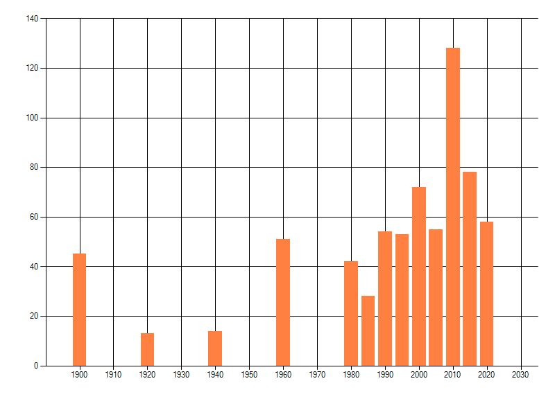 Het aantal atlasblokken (5x5 km) waarin de soort is gemeld binnen een periode van vijf jaar (vanaf 1980) of twintig jaar. Niet gecorrigeerd voor waarnemersinspanning en het aantal doorgegeven waarnemingen kan sterk variëren per periode, dus een trend in verspreiding kan hier niet direct uit worden afgelezen. Het opgegeven jaartal is het eerste jaar van de periode. Bron: gevalideerde waarnemingen uit de NDFF.