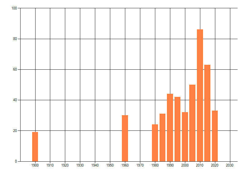 Het aantal atlasblokken (5x5 km) waarin de soort is gemeld binnen een periode van vijf jaar (vanaf 1980) of twintig jaar. Niet gecorrigeerd voor waarnemersinspanning en het aantal doorgegeven waarnemingen kan sterk variëren per periode, dus een trend in verspreiding kan hier niet direct uit worden afgelezen. Het opgegeven jaartal is het eerste jaar van de periode. Bron: gevalideerde waarnemingen uit de NDFF.