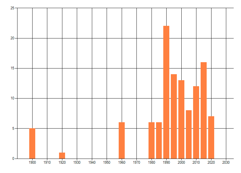 Het aantal atlasblokken (5x5 km) waarin de soort is gemeld binnen een periode van vijf jaar (vanaf 1980) of twintig jaar. Niet gecorrigeerd voor waarnemersinspanning en het aantal doorgegeven waarnemingen kan sterk variëren per periode, dus een trend in verspreiding kan hier niet direct uit worden afgelezen. Het opgegeven jaartal is het eerste jaar van de periode. Bron: gevalideerde waarnemingen uit de NDFF.