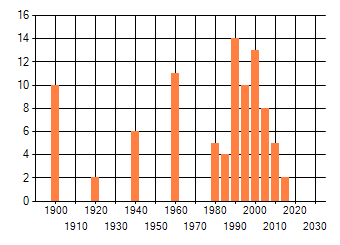 Het aantal atlasblokken (5x5 km) waarin de soort is gemeld binnen een periode van vijf jaar (vanaf 1980) of twintig jaar. Niet gecorrigeerd voor waarnemersinspanning en het aantal doorgegeven waarnemingen kan sterk variëren per periode, dus een trend in verspreiding kan hier niet direct uit worden afgelezen. Het opgegeven jaartal is het eerste jaar van de periode. Bron: gevalideerde waarnemingen uit de NDFF.