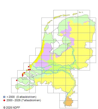 Het aantal atlasblokken (5x5 km) waarin de soort is gemeld binnen een periode van vijf jaar (vanaf 1980) of twintig jaar. Niet gecorrigeerd voor waarnemersinspanning en het aantal doorgegeven waarnemingen kan sterk variëren per periode, dus een trend in verspreiding kan hier niet direct uit worden afgelezen. Het opgegeven jaartal is het eerste jaar van de periode. Bron: gevalideerde waarnemingen uit de NDFF.