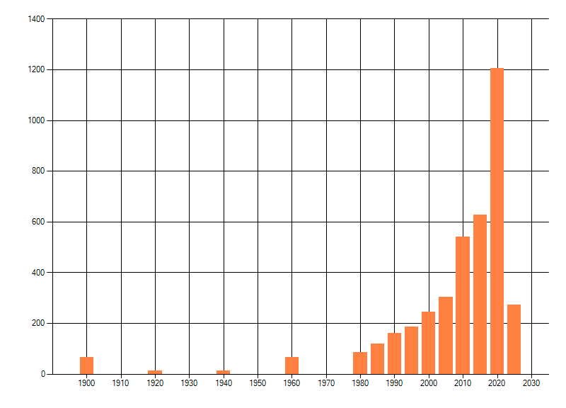 Het aantal atlasblokken (5x5 km) waarin de soort is gemeld binnen een periode van vijf jaar (vanaf 1980) of twintig jaar. Niet gecorrigeerd voor waarnemersinspanning en het aantal doorgegeven waarnemingen kan sterk variëren per periode, dus een trend in verspreiding kan hier niet direct uit worden afgelezen. Het opgegeven jaartal is het eerste jaar van de periode. Bron: gevalideerde waarnemingen uit de NDFF.