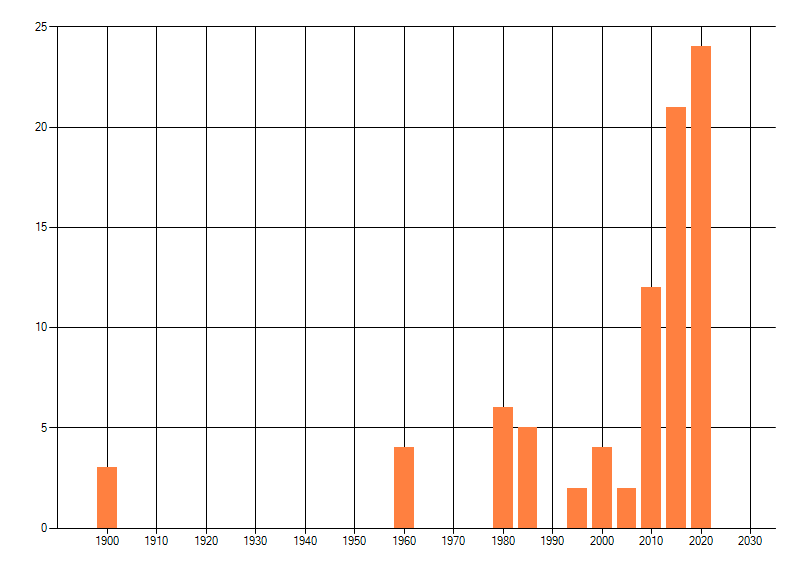 Het aantal atlasblokken (5x5 km) waarin de soort is gemeld binnen een periode van vijf jaar (vanaf 1980) of twintig jaar. Niet gecorrigeerd voor waarnemersinspanning en het aantal doorgegeven waarnemingen kan sterk variëren per periode, dus een trend in verspreiding kan hier niet direct uit worden afgelezen. Het opgegeven jaartal is het eerste jaar van de periode. Bron: gevalideerde waarnemingen uit de NDFF.