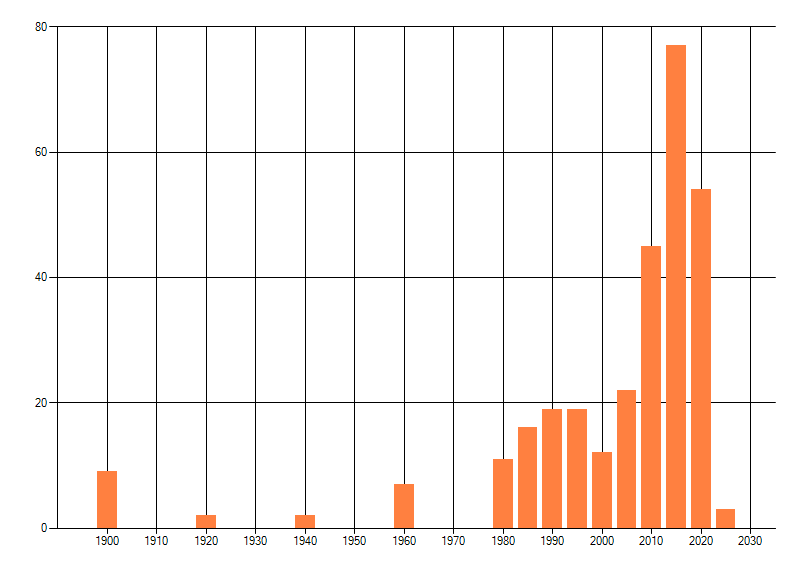 Het aantal atlasblokken (5x5 km) waarin de soort is gemeld binnen een periode van vijf jaar (vanaf 1980) of twintig jaar. Niet gecorrigeerd voor waarnemersinspanning en het aantal doorgegeven waarnemingen kan sterk variëren per periode, dus een trend in verspreiding kan hier niet direct uit worden afgelezen. Het opgegeven jaartal is het eerste jaar van de periode. Bron: gevalideerde waarnemingen uit de NDFF.