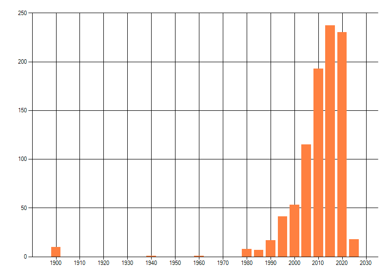 Het aantal atlasblokken (5x5 km) waarin de soort is gemeld binnen een periode van vijf jaar (vanaf 1980) of twintig jaar. Niet gecorrigeerd voor waarnemersinspanning en het aantal doorgegeven waarnemingen kan sterk variëren per periode, dus een trend in verspreiding kan hier niet direct uit worden afgelezen. Het opgegeven jaartal is het eerste jaar van de periode. Bron: gevalideerde waarnemingen uit de NDFF.