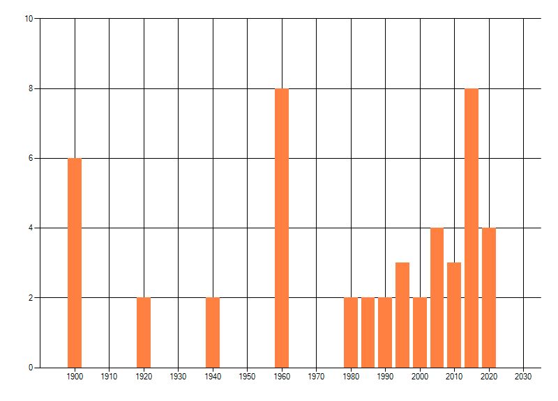 Het aantal atlasblokken (5x5 km) waarin de soort is gemeld binnen een periode van vijf jaar (vanaf 1980) of twintig jaar. Niet gecorrigeerd voor waarnemersinspanning en het aantal doorgegeven waarnemingen kan sterk variëren per periode, dus een trend in verspreiding kan hier niet direct uit worden afgelezen. Het opgegeven jaartal is het eerste jaar van de periode. Bron: gevalideerde waarnemingen uit de NDFF.