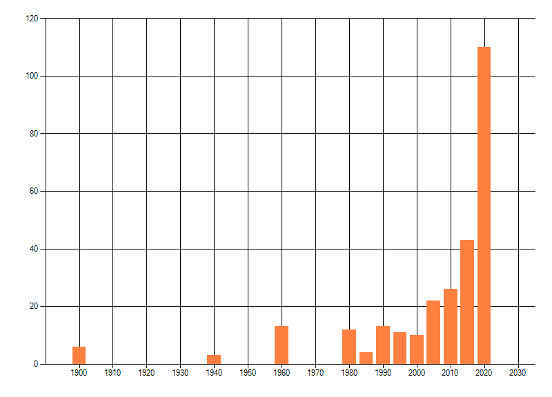Het aantal atlasblokken (5x5 km) waarin de soort is gemeld binnen een periode van vijf jaar (vanaf 1980) of twintig jaar. Niet gecorrigeerd voor waarnemersinspanning en het aantal doorgegeven waarnemingen kan sterk variëren per periode, dus een trend in verspreiding kan hier niet direct uit worden afgelezen. Het opgegeven jaartal is het eerste jaar van de periode. Bron: gevalideerde waarnemingen uit de NDFF.