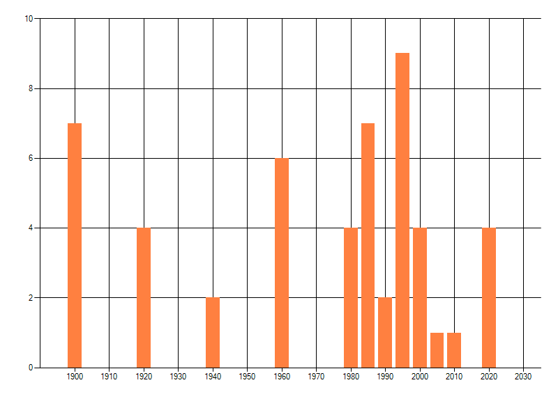 Het aantal atlasblokken (5x5 km) waarin de soort is gemeld binnen een periode van vijf jaar (vanaf 1980) of twintig jaar. Niet gecorrigeerd voor waarnemersinspanning en het aantal doorgegeven waarnemingen kan sterk variëren per periode, dus een trend in verspreiding kan hier niet direct uit worden afgelezen. Het opgegeven jaartal is het eerste jaar van de periode. Bron: gevalideerde waarnemingen uit de NDFF.