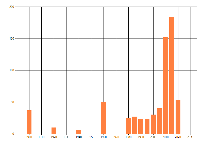 Het aantal atlasblokken (5x5 km) waarin de soort is gemeld binnen een periode van vijf jaar (vanaf 1980) of twintig jaar. Niet gecorrigeerd voor waarnemersinspanning en het aantal doorgegeven waarnemingen kan sterk variëren per periode, dus een trend in verspreiding kan hier niet direct uit worden afgelezen. Het opgegeven jaartal is het eerste jaar van de periode. Bron: gevalideerde waarnemingen uit de NDFF.