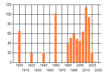 Het aantal atlasblokken (5x5 km) waarin de soort is gemeld binnen een periode van vijf jaar (vanaf 1980) of twintig jaar. Niet gecorrigeerd voor waarnemersinspanning en het aantal doorgegeven waarnemingen kan sterk variëren per periode, dus een trend in verspreiding kan hier niet direct uit worden afgelezen. Het opgegeven jaartal is het eerste jaar van de periode. Bron: gevalideerde waarnemingen uit de NDFF.