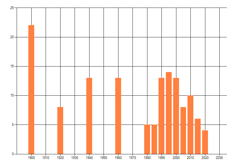 Het aantal atlasblokken (5x5 km) waarin de soort is gemeld binnen een periode van vijf jaar (vanaf 1980) of twintig jaar. Niet gecorrigeerd voor waarnemersinspanning en het aantal doorgegeven waarnemingen kan sterk variëren per periode, dus een trend in verspreiding kan hier niet direct uit worden afgelezen. Het opgegeven jaartal is het eerste jaar van de periode. Bron: gevalideerde waarnemingen uit de NDFF.