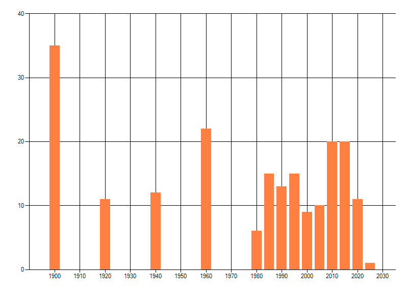 Het aantal atlasblokken (5x5 km) waarin de soort is gemeld binnen een periode van vijf jaar (vanaf 1980) of twintig jaar. Niet gecorrigeerd voor waarnemersinspanning en het aantal doorgegeven waarnemingen kan sterk variëren per periode, dus een trend in verspreiding kan hier niet direct uit worden afgelezen. Het opgegeven jaartal is het eerste jaar van de periode. Bron: gevalideerde waarnemingen uit de NDFF.