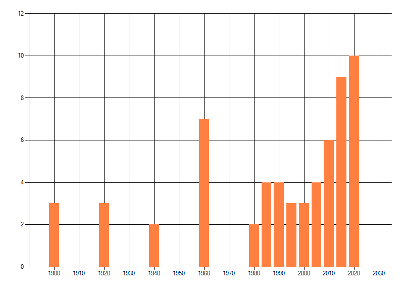 Het aantal atlasblokken (5x5 km) waarin de soort is gemeld binnen een periode van vijf jaar (vanaf 1980) of twintig jaar. Niet gecorrigeerd voor waarnemersinspanning en het aantal doorgegeven waarnemingen kan sterk variëren per periode, dus een trend in verspreiding kan hier niet direct uit worden afgelezen. Het opgegeven jaartal is het eerste jaar van de periode. Bron: gevalideerde waarnemingen uit de NDFF.