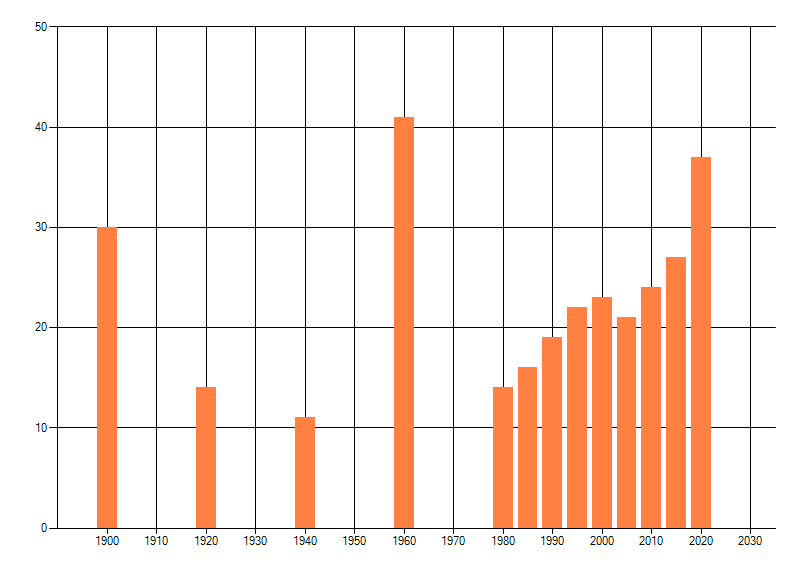 Het aantal atlasblokken (5x5 km) waarin de soort is gemeld binnen een periode van vijf jaar (vanaf 1980) of twintig jaar. Niet gecorrigeerd voor waarnemersinspanning en het aantal doorgegeven waarnemingen kan sterk variëren per periode, dus een trend in verspreiding kan hier niet direct uit worden afgelezen. Het opgegeven jaartal is het eerste jaar van de periode. Bron: gevalideerde waarnemingen uit de NDFF.