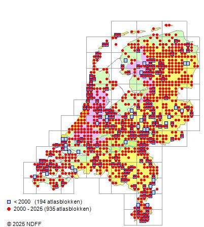 Het aantal atlasblokken (5x5 km) waarin de soort is gemeld binnen een periode van vijf jaar (vanaf 1980) of twintig jaar. Niet gecorrigeerd voor waarnemersinspanning en het aantal doorgegeven waarnemingen kan sterk variëren per periode, dus een trend in verspreiding kan hier niet direct uit worden afgelezen. Het opgegeven jaartal is het eerste jaar van de periode. Bron: gevalideerde waarnemingen uit de NDFF.