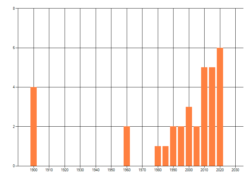 Het aantal atlasblokken (5x5 km) waarin de soort is gemeld binnen een periode van vijf jaar (vanaf 1980) of twintig jaar. Niet gecorrigeerd voor waarnemersinspanning en het aantal doorgegeven waarnemingen kan sterk variëren per periode, dus een trend in verspreiding kan hier niet direct uit worden afgelezen. Het opgegeven jaartal is het eerste jaar van de periode. Bron: gevalideerde waarnemingen uit de NDFF.
