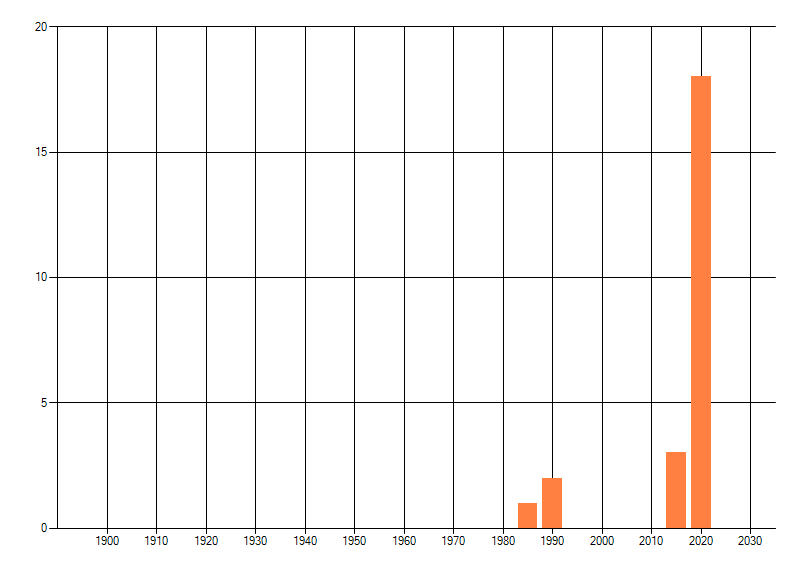 Het aantal atlasblokken (5x5 km) waarin de soort is gemeld binnen een periode van vijf jaar (vanaf 1980) of twintig jaar. Niet gecorrigeerd voor waarnemersinspanning en het aantal doorgegeven waarnemingen kan sterk variëren per periode, dus een trend in verspreiding kan hier niet direct uit worden afgelezen. Het opgegeven jaartal is het eerste jaar van de periode. Bron: gevalideerde waarnemingen uit de NDFF.