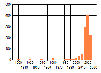 Het aantal atlasblokken (5x5 km) waarin de soort is gemeld binnen een periode van vijf jaar (vanaf 1980) of twintig jaar. Niet gecorrigeerd voor waarnemersinspanning en het aantal doorgegeven waarnemingen kan sterk variëren per periode, dus een trend in verspreiding kan hier niet direct uit worden afgelezen. Het opgegeven jaartal is het eerste jaar van de periode. Bron: gevalideerde waarnemingen uit de NDFF.
