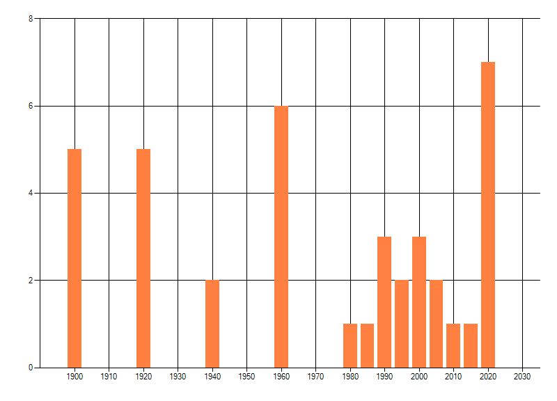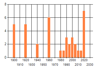 Het aantal atlasblokken (5x5 km) waarin de soort is gemeld binnen een periode van vijf jaar (vanaf 1980) of twintig jaar. Niet gecorrigeerd voor waarnemersinspanning en het aantal doorgegeven waarnemingen kan sterk variëren per periode, dus een trend in verspreiding kan hier niet direct uit worden afgelezen. Het opgegeven jaartal is het eerste jaar van de periode. Bron: gevalideerde waarnemingen uit de NDFF.