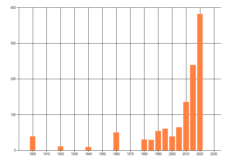 Het aantal atlasblokken (5x5 km) waarin de soort is gemeld binnen een periode van vijf jaar (vanaf 1980) of twintig jaar. Niet gecorrigeerd voor waarnemersinspanning en het aantal doorgegeven waarnemingen kan sterk variëren per periode, dus een trend in verspreiding kan hier niet direct uit worden afgelezen. Het opgegeven jaartal is het eerste jaar van de periode. Bron: gevalideerde waarnemingen uit de NDFF.