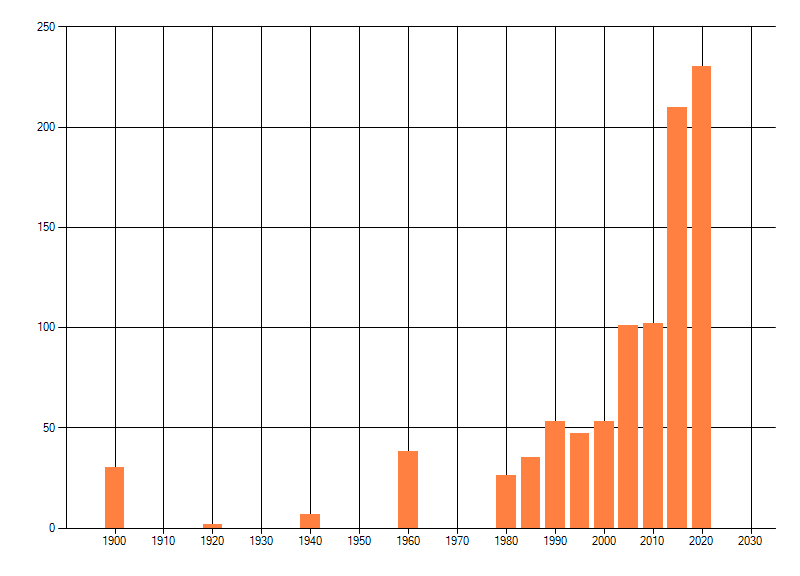 Het aantal atlasblokken (5x5 km) waarin de soort is gemeld binnen een periode van vijf jaar (vanaf 1980) of twintig jaar. Niet gecorrigeerd voor waarnemersinspanning en het aantal doorgegeven waarnemingen kan sterk variëren per periode, dus een trend in verspreiding kan hier niet direct uit worden afgelezen. Het opgegeven jaartal is het eerste jaar van de periode. Bron: gevalideerde waarnemingen uit de NDFF.