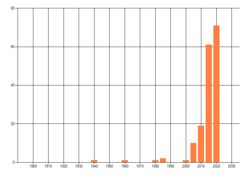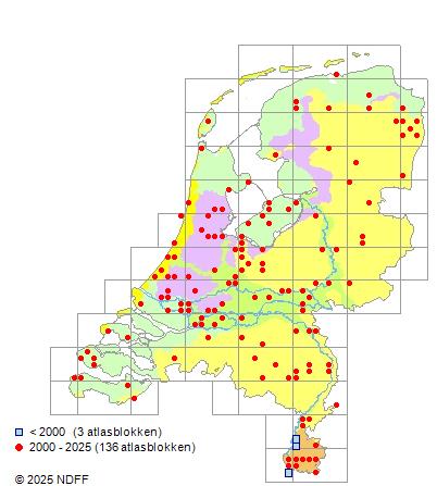 Het aantal atlasblokken (5x5 km) waarin de soort is gemeld binnen een periode van vijf jaar (vanaf 1980) of twintig jaar. Niet gecorrigeerd voor waarnemersinspanning en het aantal doorgegeven waarnemingen kan sterk variëren per periode, dus een trend in verspreiding kan hier niet direct uit worden afgelezen. Het opgegeven jaartal is het eerste jaar van de periode. Bron: gevalideerde waarnemingen uit de NDFF.