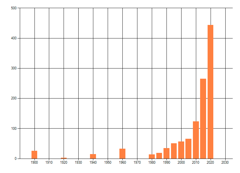 Het aantal atlasblokken (5x5 km) waarin de soort is gemeld binnen een periode van vijf jaar (vanaf 1980) of twintig jaar. Niet gecorrigeerd voor waarnemersinspanning en het aantal doorgegeven waarnemingen kan sterk variëren per periode, dus een trend in verspreiding kan hier niet direct uit worden afgelezen. Het opgegeven jaartal is het eerste jaar van de periode. Bron: gevalideerde waarnemingen uit de NDFF.