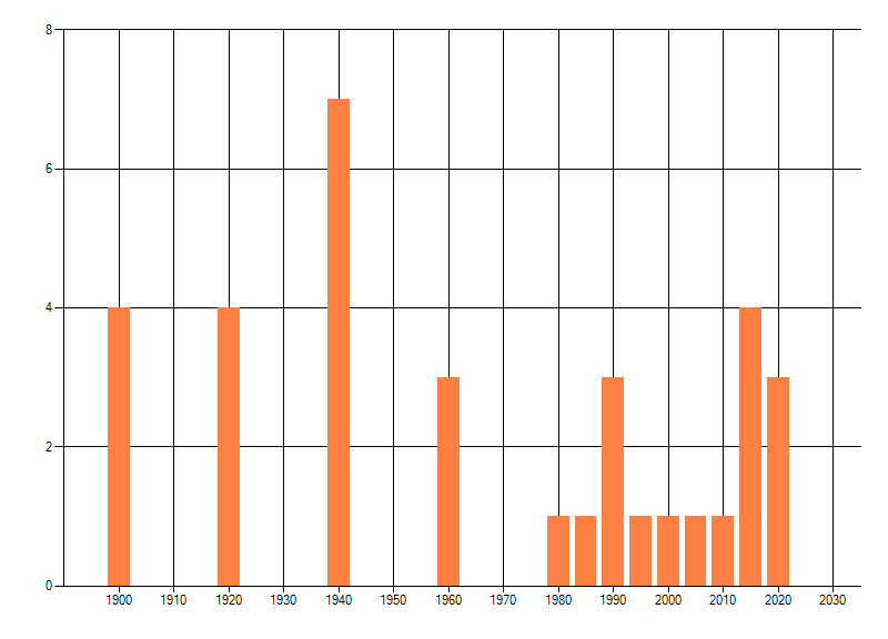 Het aantal atlasblokken (5x5 km) waarin de soort is gemeld binnen een periode van vijf jaar (vanaf 1980) of twintig jaar. Niet gecorrigeerd voor waarnemersinspanning en het aantal doorgegeven waarnemingen kan sterk variëren per periode, dus een trend in verspreiding kan hier niet direct uit worden afgelezen. Het opgegeven jaartal is het eerste jaar van de periode. Bron: gevalideerde waarnemingen uit de NDFF.